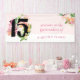 Elegante Banner Quinceanera para la celebración de la fiesta de cumpleaños número 15. Moda de diseño floral en rosa y oro. Diseño onírico muy femenino de rosas acuarelas, flores y vegetación con detalles dorados. La gran variedad y la facilidad de personalización. Consulte mi colección Quinceanera de Moda floral para ver los elementos coincidentes o, envíeme un mensaje para crear las plantillas que necesita.