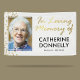 Cartel conmemorativo del funeral con un fondo blanco angélico que puede cambiarse a cualquier color, una foto de tu ser querido, un purpurina brillante de oro, las palabras "en la memoria amorosa" en un guion con un falso Relieve metalizado de oro, el nombre de las personas, más su fecha de nacimiento y de muerte.