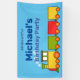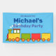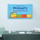 Colorido tren de juguete de dibujos animados en una pancarta azul. Plantillas para agregar su nombre.