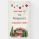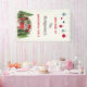 Una pancarta de un fiesta Navidad con un tema de Navidades tierno y caprichoso. Un acogedor remolque decorado para Navidades entre pinos. Decoración de árboles en la parte superior.