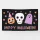 Esta adorable pancarta de la fiesta de Halloween incluye un cráneo dibujado a mano, calabaza de linternas (usando un gorra de brujas) y fantasma, junto con estrellas y tipografía moderna, que dice "¡FELIZ HALLOWEEN!" La paleta de colores es de tonos pastel, violeta, rosa y melocotón sobre un fondo negro. ¡Fácil de personalizar para la espeluznante fiesta temática de Halloween de tu hijo! *Obra de arte de Orabella Prints.