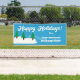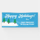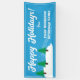 Banner de Felices Fiestas para un desfile de Navidad o exhibición en casa o tienda muestra árboles de pino en la nieve contra un fondo azul. Edite el texto para su nombre, negocio o grupo.