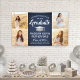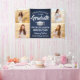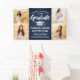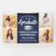 Agregue un toque personalizado a las decoraciones de la fiesta de graduación de la universidad o la escuela secundaria con este banner personalizado de 4 fotos en azul marino, blanco y plateado. (CONSEJO DE UBICACIÓN DE IMAGEN: una forma fácil de centrar una foto exactamente como la desea es recortarla antes de subirla al sitio web de Zazzle.) El diseño presenta un fondo azul ombre, una gorra de graduación de acero inoxidable cepillado falso, tipografía moderna elegante, caligrafía estilizada a mano y cuatro fotos del graduado, como fotos de último año o imágenes de la ceremonia de graduación. Tenga en cuenta que el plateado es un color impreso, no un foil metálico. Este letrero de fiesta es una forma elegante de celebrar el día especial. ¡Felicitaciones al graduado!