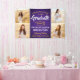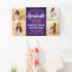 Añada un toque personalizado a las decoraciones de la fiesta de graduación de la universidad o la escuela secundaria con este pancarta de collage de fotos en color morado, dorado amarillo y blanco, de personalizado 4. (IMAGEN PLACEMENT TIP: Una manera fácil de centrar una foto exactamente como quieres es recortarla antes de subirla al sitio web de Zazzle.) El diseño presenta un fondo oscuro morado, tipografía moderna y elegante, caligrafía de escritura a mano y cuatro fotos del graduado, como imágenes de la ceremonia de graduación o de la ceremonia de graduación. Tenga en cuenta que el oro es de color amarillo impreso, no Relieve metalizado metálico. Este cartel fiesta es una manera elegante de celebrar el día especial. ¡Felicitaciones al graduado!