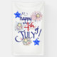 Diseño que dice "¡Feliz 4 de julio!" con estrellas y fuegos artificiales por todas partes.