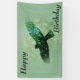 Esta pancarta de tela tiene una fotografía alterada de un cuervo negro transparente volador contra la cubierta de un árbol descolorido sobre un fondo verde. Personalizar el texto Feliz Cumpleaños con las plantillas.