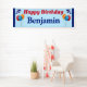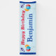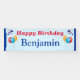 Cartel personalizado del cumpleaños feliz para un niño o un hombre de cualquier edad. Incluye globos coloridos, estrellas de celebración, y borde de rayas azules. Sólo personaliza con el nombre del niño. Esta pancarta es simple, divertida, festiva y fácil de leer a distancia si la colocas afuera en la parte delantera de la casa, o en una fiesta de cumpleaños para niños. ¡Una gran sorpresa para cualquier chico o hombre! Este cartel de cumpleaños no tiene año de cumpleaños, así que puede ser reutilizado por muchos años. En un fondo azul pálido o cambie a blanco si lo desea. El tamaño del texto se puede cambiar si es necesario para ajustar el área. Disponible para interiores o exteriores, consulte las opciones de selección.