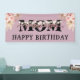 Una pancarta festiva de feliz cumpleaños fiesta para mamá, con flores y luces de cuerda en un fondo rosado, y te amo mamá con una letra de guión.