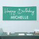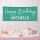 Banner básico, simple, verde azulado y blanco "Feliz cumpleaños" fiesta personalizado con el nombre del invitado de honor en una tipografía de escritura caprichosa.