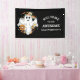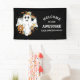 Cartel de Halloween con el ilustracion de un fantasma sonriente. Decorado con flores, arcos de lluvia y murciélagos.