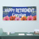 Cartel de feliz fiesta de retiro con un tema tropical: frondas de palmeras y flores de hibisco gigantes sobre un fondo azul brillante. Edita el nombre a tu invitado de honor. Ideal para quien ama la playa o se retira a Florida, o sólo para un divertido tema de fiesta jubilatorio con decoración luau o tropical insular.