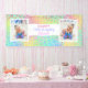 Banner de la fiesta de cumpleaños chica colorido con un fondo de patrón animal de color brillante con colores rosa, verde, azul, amarillo y violeta. Personalizada con su nombre, edad y 2 fotos.
