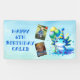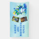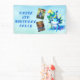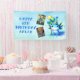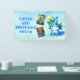 Banner personalizado de la fiesta de cumpleaños del niño con temática Axolotl azul y verde. Un lindo axolotl en un gorra de cumpleaños con globos.