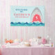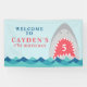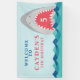 Banner de la fiesta de cumpleaños del tiburón mordido con gran boca de tiburón, olas turquesa y texto rojo.