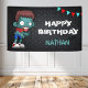 Invite a sus huéspedes con este fantástico banner de la fiesta de cumpleaños de Halloween que presenta un divertido zombi personalizado con tipografía moderna sobre un fondo de acero oscuro.