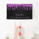 Una pancarta para una fiesta de cumpleaños número 50 (o de cualquier edad) glamurosa y femenina. Un fondo negro de moda con elegantes goteos en purpurina de imitación violeta, pinturas de goteo. El texto: Personalice y agregue un nombre escrito con un color púrpura claro en un guión de estilo moderno con letras a mano. Plantillas para una fecha y edad de 50 años. Es perfecto como una banner de bienvenida o como decoración fiesta.