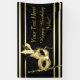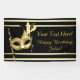 Bandera de fiesta de disfraz de máscaras negro y dorado con hermosa máscara de plumas negra y dorada en un hermoso fondo negro y dorado. Esta elegante bandera de fiesta de disfraz de máscaras dorada puede ser personalizada con tu texto en el estilo de fuente que elijas.