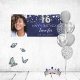 Celebrando un dulce 16. Un fondo azul oscuro. El color azul es desigual. Decorada con estrellas falsas de plata. Personalice y agregue su propia foto del chica de cumpleaños. Usar una foto de tamaño vertical/vertical. El texto: El nombre en gris con una escritura de estilo con letras a mano moderna. Personalice y agregue un nombre, edad y fecha. Se puede utilizar como banner de bienvenida o como decoración de paredes fiestas.