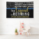 Este diseño presenta una bandera de la fuerza policial con franjas negras y blancas, y una franja de línea azul delgada también. El texto "La Leyenda se Jubila" en dorado se sitúa encima del nombre personalizable del oficial de la ley, sheriff, capitán o jefe que se jubila. ¡Celebre este hito con estilo!