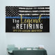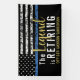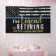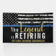 Este diseño presenta una bandera de la fuerza policial con franjas negras y blancas, y una franja de línea azul delgada también. El texto "La Leyenda se Jubila" en dorado se sitúa encima del nombre personalizable del oficial de policía, alguacil, capitán o jefe que se jubila. ¡Celebre este hito con estilo!