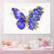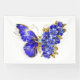 Joyería, azul, zafiro, mariposa floral brillante con ala decorada con flores azules y preciosas con hojas de oro sobre fondo blanco.