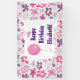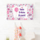 Banner personalizado de cumpleaños con un lindo patrón floral. Compuesto por flores de forma rosada y violeta irregulares en un estilo retro de los años 60 groovy. El desmayo desvaneció los corazoncitos azules, pimienta el fondo sobre un fondo azul pálido.