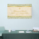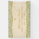 El fondo es el patrón de papel pintado vintage "Willow Bough" diseñado por William Morris (1834–1896), ahora en dominio público. Tiene ramas de sauce con hojas verdes sobre fondo blanco. El texto es dorado, dentro de una amplia franja blanca (el color del papel viejo) con bordes de lámina dorada falsa, y tiene una cruz dorada falsa encima. El mensaje "Bienvenido a [Nombre]'s" está escrito en una elegante letra caligráfica, el resto en mayúsculas.