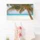 Escena tropical de fondo de playa con palmeras inclinadas, arena y océano azul acuático. Puede agregar texto para un evento, o puede usarse para un fondo de cabina de fotos, para un luau o un fiesta tiki, o para cualquier otro propósito. También es divertido como telón de fondo para videoconferencia, transmisión en vivo o celebración virtual. Esto se hace a partir de una fotografía representada artísticamente hecha para que parezca más un cuadro.