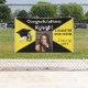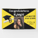 Este es un banner de vinilo de grado al aire libre con manchas metalizado. Se puede personalizar completamente con la foto, el nombre, el mensaje, el año de clase y el nombre de la ciudad y la escuela del estudiante. Incluye una pintura de casquillo y diploma, que también se puede personalizar.