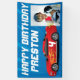 ¡Añada su foto de los niños pequeños a esta bandera impresionante del cumpleaños del coche de carreras! Ofrece una barra candente fresca estupenda con las llamas en las ruedas laterales y negras. ¡Fondo azul brillante y el nombre y la foto de su hijo! Una gran sorpresa para una decoración de la fiesta de cumpleaños del tema de las carreras de coches de los niños.