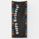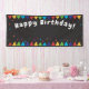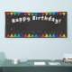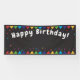 Cartel de cumpleaños feliz para el telón de fondo de la foto o celebración de cumpleaños virtual. Los colores brillantes de los tres ángulos en la parte superior e inferior junto con los confeti y las estrellas esparcidas alrededor del texto sobre un fondo negro hacen una declaración festiva.