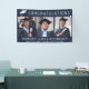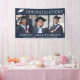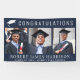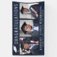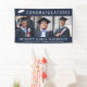 Elegante cartel de bienvenida de fiesta de graduación azul oscuro y fondo de foto para celebrar al graduado con "Felicitaciones" en una gran tipografía blanca, un ilustracion de una gorra de graduación, un collage de tres fotos y su nombre, año de clase y nombre escolar en tipografía blanca moderna. Los colores del fondo y del texto se pueden editar para que coincidan con los colores de la escuela seleccionando "personalizar más adelante".