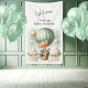 Adventure themed baby shower, vertical Welcome banner with an adorable fox holding a teddy bear riding in a green hot air balloon. The watercolor green sky has white clouds with surrounding gold stars. Template included.