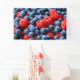 Este diseño presenta una imagen de primer plano de frambuesas y arándanos, que son frutos sanos. Las frambuesas son rojas y las arándanas, como su nombre indica, azules.