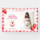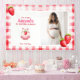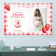 Eleva a tu fiesta con nuestro encantador cartel de fondo de Gingham de Fresas Vintage que resalta a tu futura madre con una hermosa foto de ella. Esta deliciosa pancarta prepara el escenario para inolvidables duchas de bebé, invitaciones de recién nacido y celebraciones de revelación de género. Su retro estampado de fresa rosa y de color rojo, adornado con un mono de mono de paracaidismo y fresas maduras, le da un toque nostálgico a su evento especial. Este cartel tiene un mensaje de personalizable que dice "¡El nombre tiene un bebé!" que es completamente editable y con una sección para el nombre de la futura madre y la fecha del evento, o fecha de vencimiento, según usted decida. Es una manera reconfortante de mostrar amor a la futura mamá y celebrar su próximo viaje dulce de berry para convertirse en una mamá. Todas las palabras de texto son modificables. Así que puedes cambiar "es tener un bebé" a "ducha de novia" si lo prefieres. Perfecto para una variedad de temas como la moda de campo, el cottagecore, la casa de campo vintage y el clásico picnic retro de los años 50, esta pancarta de fondo hace las delicias de las fotografías como telón de fondo, y también como una pieza de decoración fiesta, elegante y personalizada, colgada en la pared sobre la mesa de postres.