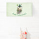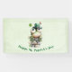 Banner with a cute St. Patrick's Day image. A green frog with big cartoon eyes sitting on a stone wall. Wearing a green top hat with a shamrock and a little friend sitting on top of his hat.