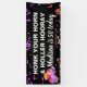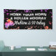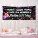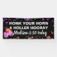 Funny Happy 50th Birthday Honk Your Horn Name BannerDiseñado con un fondo negro personalizable y globos de arcoiris coloridos y un fondo de confeti falso purpurina sobre negro. Graciosa frase "Honk Your Horn Holler and Wave" seguida de un nombre personalizado y "is 50 today" en negrita y letras en blanco.