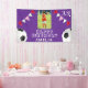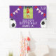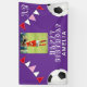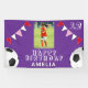 Fútbol Balón Banderas Foto Cumpleaños Banner Morado. El diseño tiene dos balones de fútbol y banderines de fiesta de cumpleaños en colores rojo, rosa y blanco sobre fondo morado. Agrega tu foto y personalízalo con tu nombre, edad y texto para crear tu propio banner de cumpleaños. Ideal para niños y niñas que aman el fútbol.