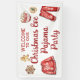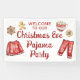 Bienvenidos invitados con estilo festivo con este banner de fiesta de pijamas de Nochebuena. Diseñado con encanto festivo juguetón, presenta pijamas rojas acogedoras decoradas con copos de nieve, una taza humeante de cacao, galletas de jengibre y golosinas festivas glaseadas. La letra roja en negrita dice "Bienvenidos a nuestra fiesta de pijamas de Nochebuena" contra un fondo blanco crujiente, creando una exhibición alegre e invitadora. Perfecto para colgar en la entrada de su fiesta, mesa de postres o fondo de fotos, este banner marca el tono para una noche acogedora de cacao, galletas y alegría navideña. Una adición encantadora a las reuniones familiares, fiestas vecinales o celebraciones de pijamas para niños, este letrero agrega calidez y fantasía a sus festividades navideñas. Comb