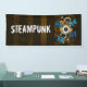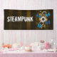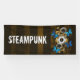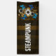 Composición de reloj de vapor redondo con dial numérico romano negro, decorado con arcos de oro y latón, mariposas morfo azules y lentes dañadas sobre fondo rayado marrón. Estilo Steampunk.