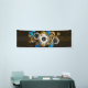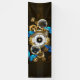 Composición de reloj de vapor redondo con dial numérico romano negro, decorado con arcos de oro y latón, mariposas morfo azules y lentes dañadas sobre fondo rayado marrón. Estilo Steampunk.