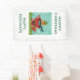 Una pancarta con la imagen de un adorable gato naranja sentado en una taza de té. Llevando un gorra de invierno y una bufanda. Copos de nieve cayendo contra una plaza verde claro. Patrón de fondo de copo de nieve blanco. El texto dice Navidades Meowy y Felices Fiestas.