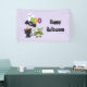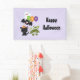 Una pancarta de Halloween con un bate volador negro, un bate de momia verde con vendas blancas y un lindo gato negro con un gorra de brujas naranja. Boo escrito en divertidas letras coloridas con un fantasma feliz flotando detrás. Fondo morado claro.