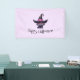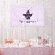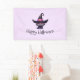 Pancarta de Halloween con un divertido ilustracion temático de Halloween para los amantes de los gatos. Un gato negro de ojos grandes vestido con el gorra de una gran bruja negra con un cinturón rosado violáceo alrededor del borde.