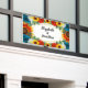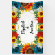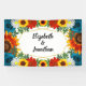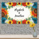 Elegante y colorido diseño floral para un evento de verano en el patio trasero. Presenta rosas azules verde azulados, margaritas blancas, flores silvestres rojas y girasoles con marco geométrico dorado