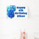 Cartel de la fiesta de cumpleaños con texto personalizado y diseño de globos azules. Banner blanco de gran tamaño (2,5 x 4 m) decorado con tres grupos de globos. Colores azul claro, azul claro y azul verde azulado junto al texto azul oscuro, negrita y grande. La frase de ejemplo es "Feliz sexto cumpleaños (nombre)". Puede agregar hasta cuatro líneas de redacción que se ajusten al espacio. El diseño es de este tamaño, pero podría funcionar en algunos otros. No dejes que ninguna letra se acerque a los bordes.