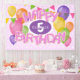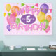 Esta divertida y colorida pancarta de cumpleaños muestra el mensaje "Feliz cumpleaños" escrito en galletas esmeriladas rosadas y realistas, rodeadas de globos multicolores y banderas de amarre - la edad y el nombre del niño se pueden personalizar - fondo es un patrón de pequeños puntos de polka blancos sobre rosa pálido - de katz_d_zynes