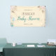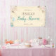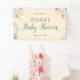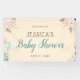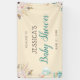 Este elegante cartel de ducha para bebés presenta flores blandas acentuadas con vegetación y plumas. Otro gráfico de la esquina inferior izquierda muestra cajas de regalo con globos. La pancarta ofrece muchos colores que hacen que sea perfecta para una ducha de bebé sin diferencias de género.