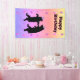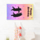 Este cartel o fondo es amarillo, salmón, rosa y morado con dos osos negros bailando felices en forma de silueta, con gorras rayados rosados y fiestas morados con dos cuerdas de estrellas en los lados. Personalizar el texto con la plantilla.