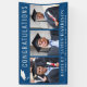 Elegante cartel clásico de bienvenida de la fiesta de graduación azul y programa de fotografía para celebrar el graduado que presenta "Felicitaciones" en una gran tipografía blanca y un ilustracion de un gorro de graduación encima, un collage de tres fotos y su nombre, año de clase y nombre escolar en tipografía blanca moderna. Los colores del fondo y del texto se pueden editar para que coincidan con los colores de la escuela seleccionando "personalizar más adelante".